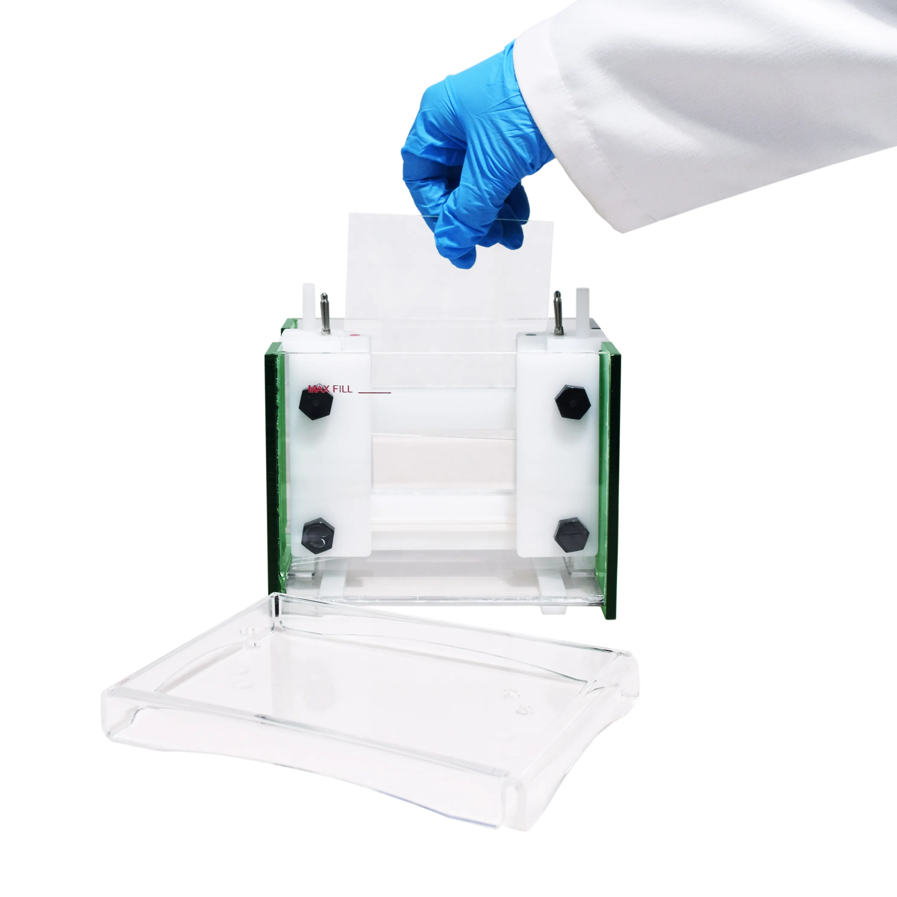 5- شیشههای تهیه ژل (یک جفت کامل Large Format): شامل شیشه تخت و شیشه U شکل، مخصوص ژل 21×20 سانتیمتر با حجم تقریبی 44 میلیلیتر برای هر ژل.